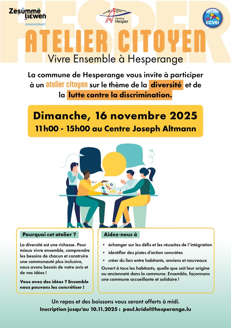 La commune de Hesperange vous invite à participer à un atelier citoyen sur le thème de la diversité et de la lutte contre la discrimination.