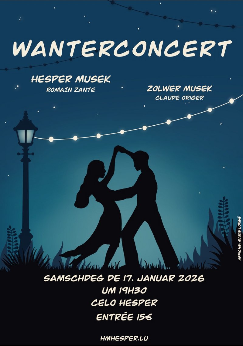 L'Harmonie municipale de Hesperange (sous la direction de Romain Sante) & l'Harmonie de Soleuvre (sous la direction de Claude Origer) vous invitent au concert d'hiver le samedi 17 janvier 2026 à 19.30 heures au CELO à Hesperange.