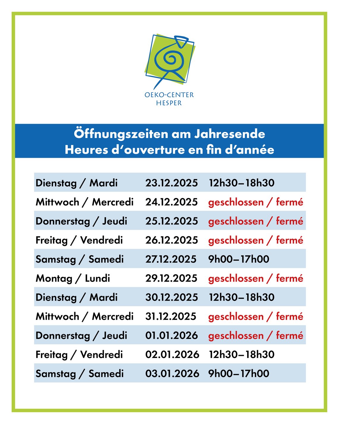 Horaires Oeko-Center