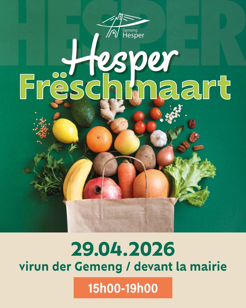 all 2. Mëttwoch vu 15 bis 19 Auer virun der Gemeng zu Hesper